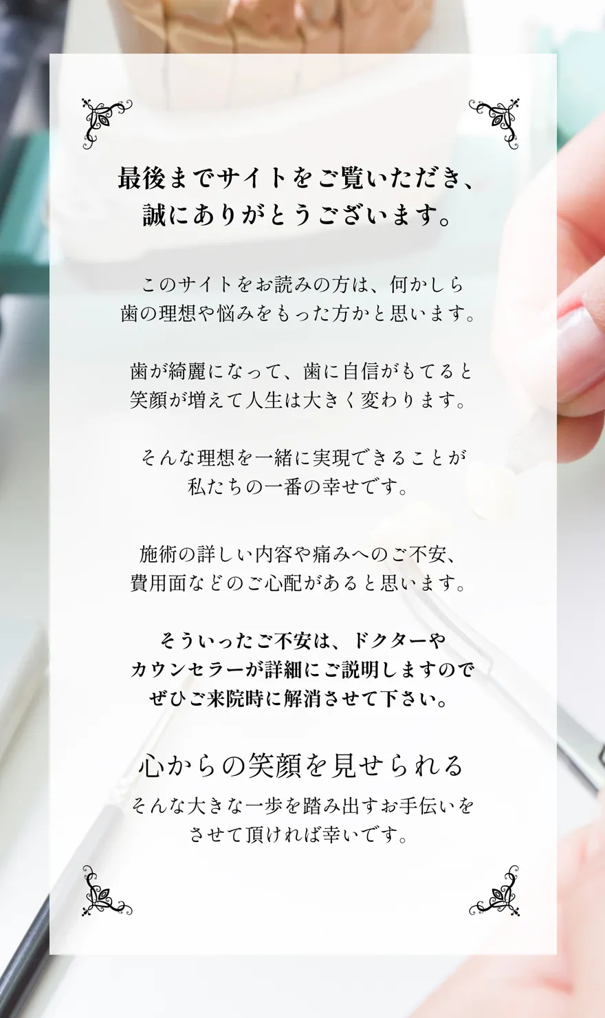 A ぜひカウンセラー、ドクターにご相談下さい!当院は審美・矯正の両方の治療方法を提案できることが特徴です。